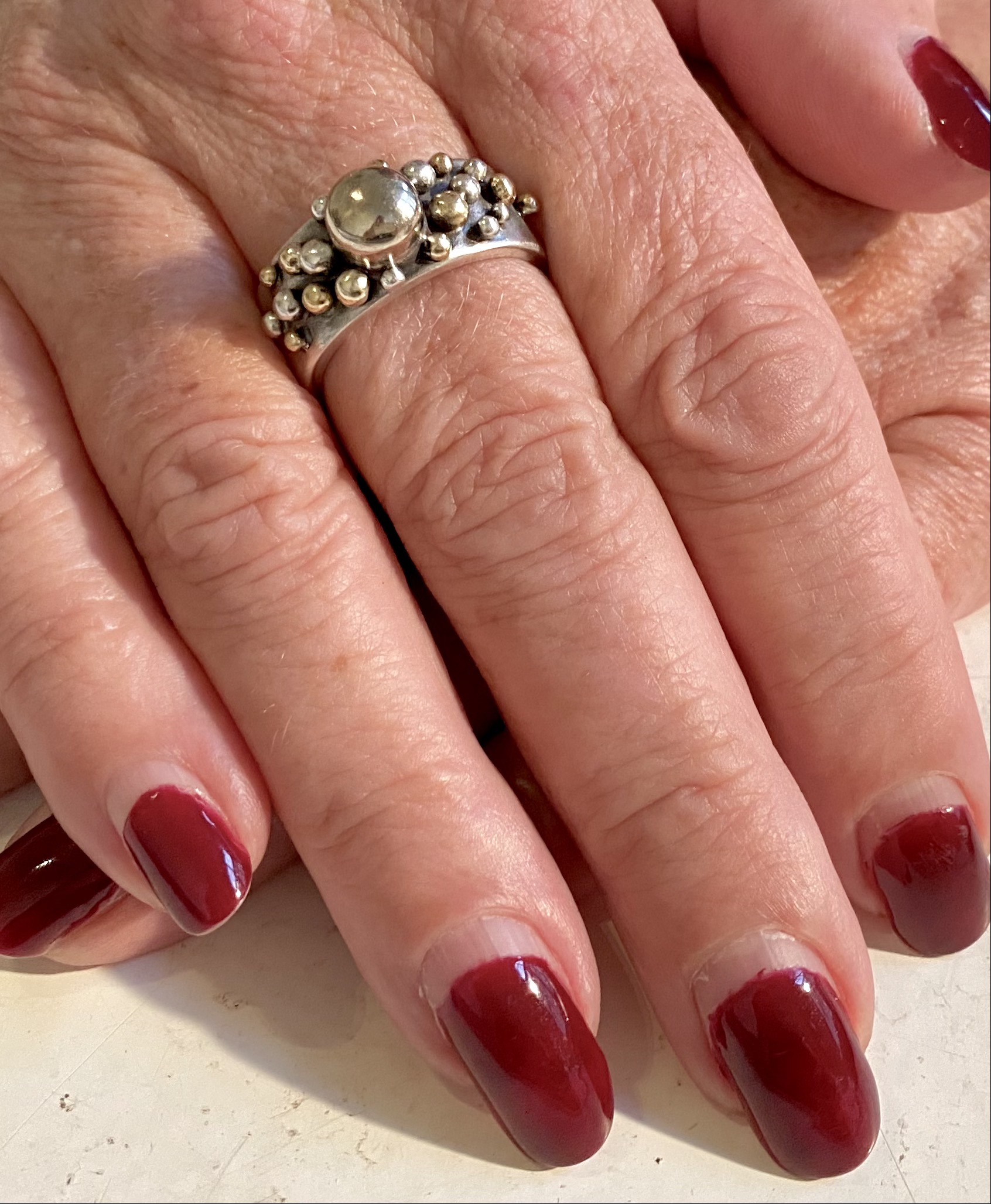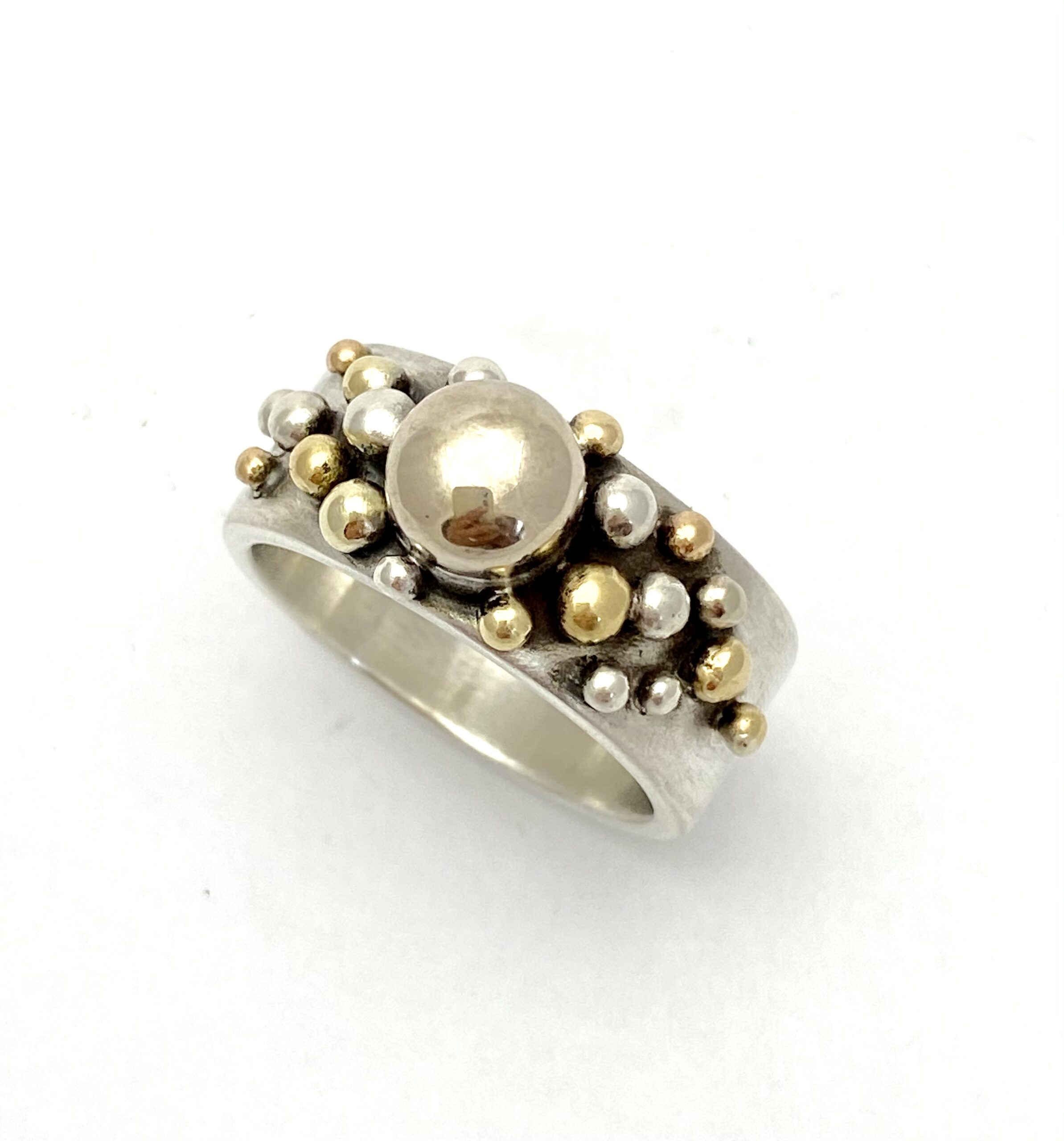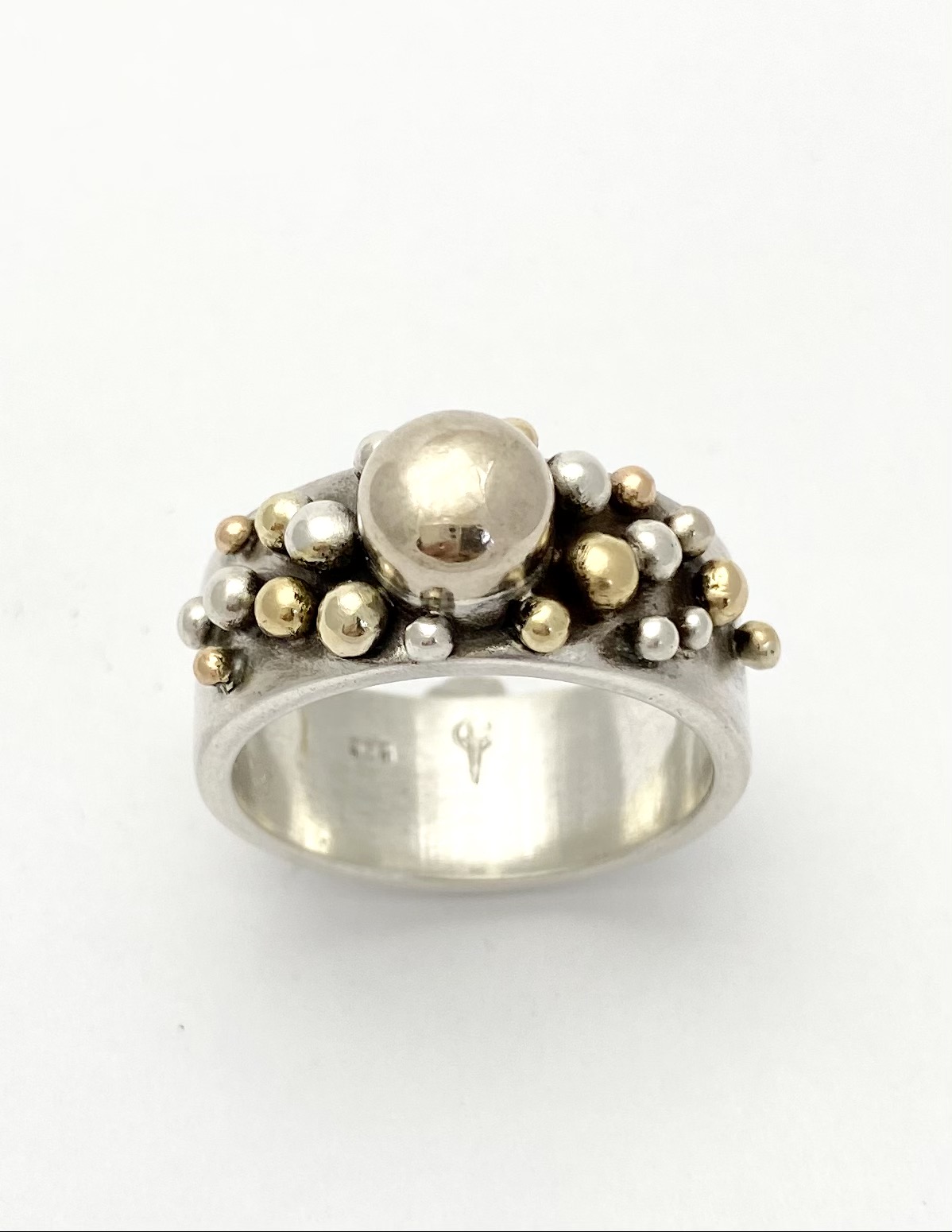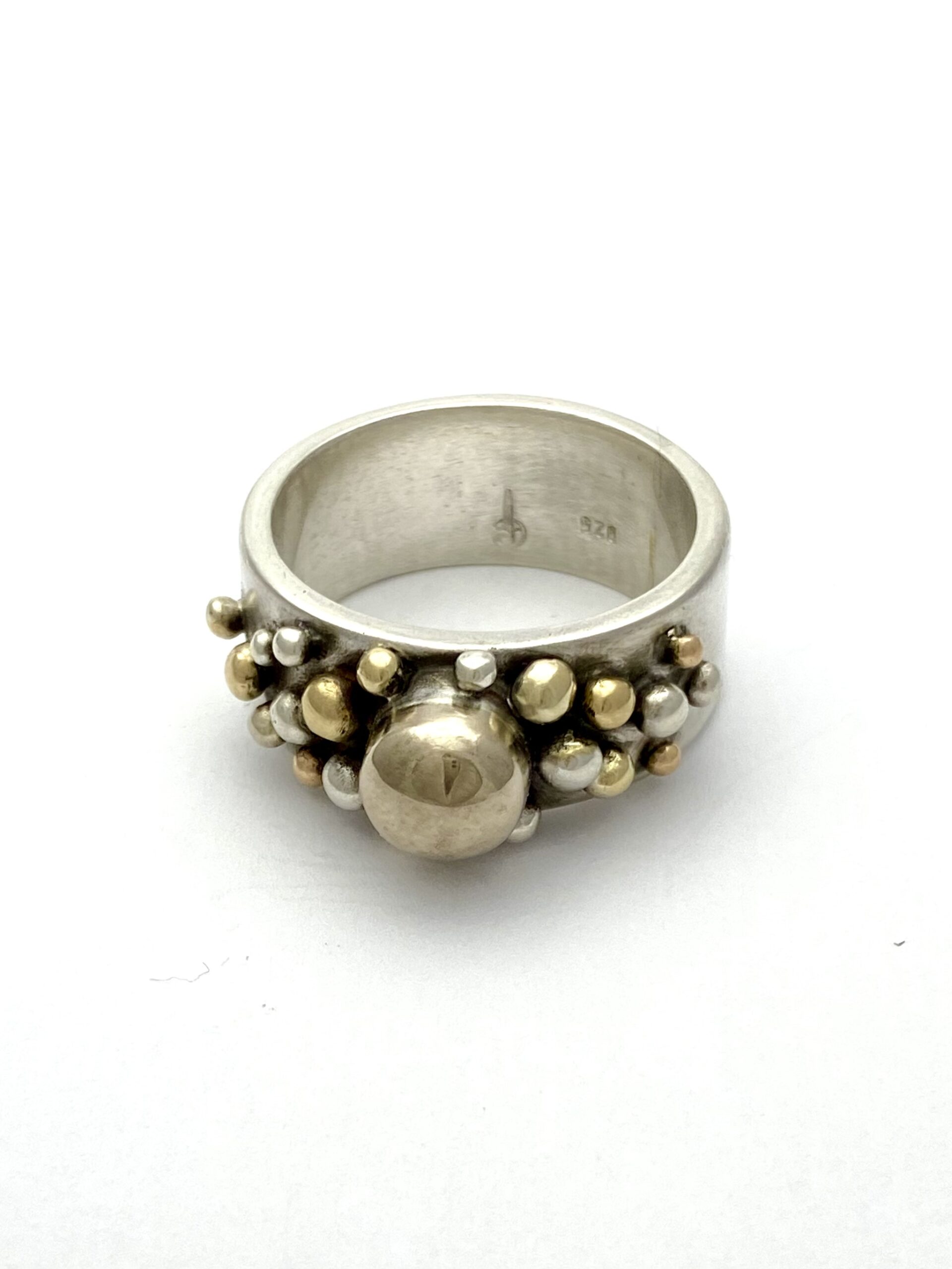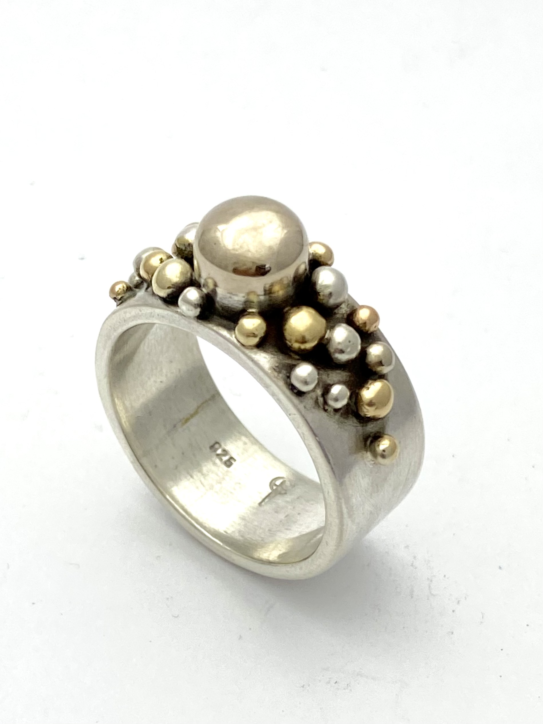 ‘Pushing buttons’ Corona ring, deze stoere ring heb ik bedacht tijdens de Corona pandemie. Bovenop de ring zit een kogel/bal van 14 Krt. witgoud (witgoud is een hard edelmetaal wat nauwelijks beschadigd) om de knopjes van de pinapparaat in te toetsen, de knopje in de tram, metro, de knopjes bij de fiets stoplichten en de knopjes in de lift. Alle knopjes waar je niet met je handen aan wilt zitten kan je bedienen met deze Corona ring. De ring is gemaakt van zilver met bovenop een witgouden kogel met daaromheen kleine zilveren en 18 krt. gouden balletjes. Een prachtige stijlvolle ring met ook nog eens een praktische functie.