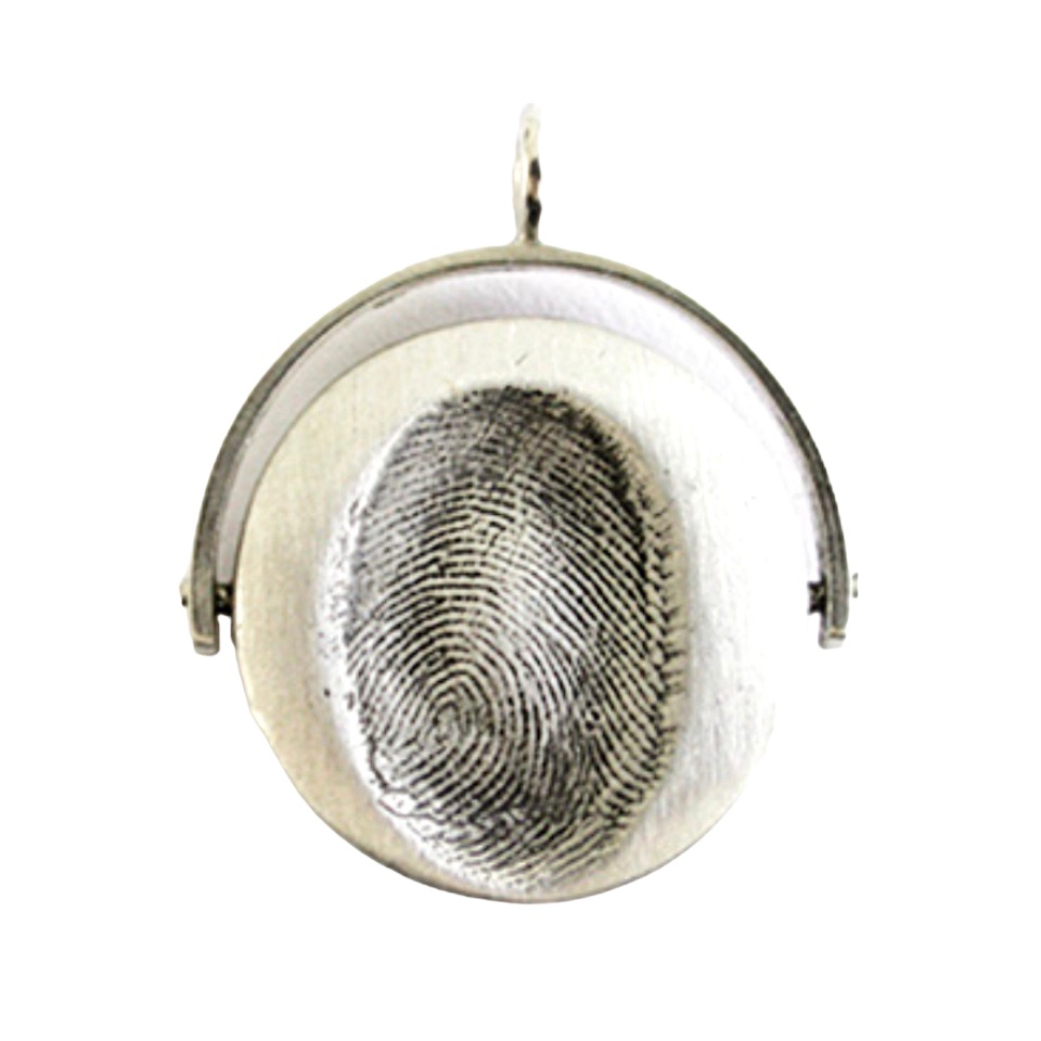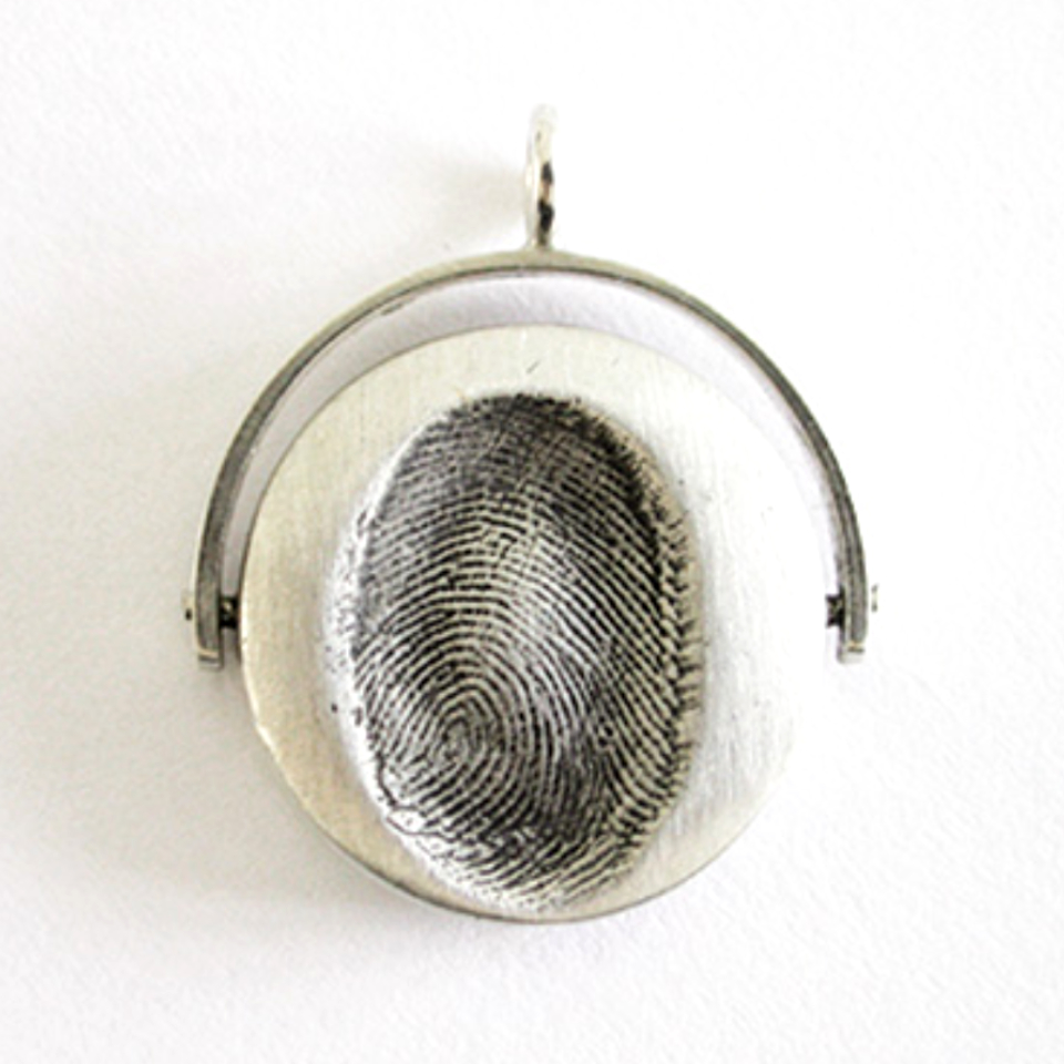 Een stoer ronddraaiende zilveren hanger met de vingerafdruk van haar twee dochters. Door het draaien van de hanger smelten de vingerafdrukken als het ware samen en worden een. Haar twee dochters zijn van dezelfde IVF-behandeling, maar geboren in verschillende jaren, dus ze zijn eigenlijk tweelingen. Voor de vingerafdruk moesten de twee dochters met hun wijsvinger tegelijkertijd heel hard tegen elkaar aan duwen in een klompje zilverklei.