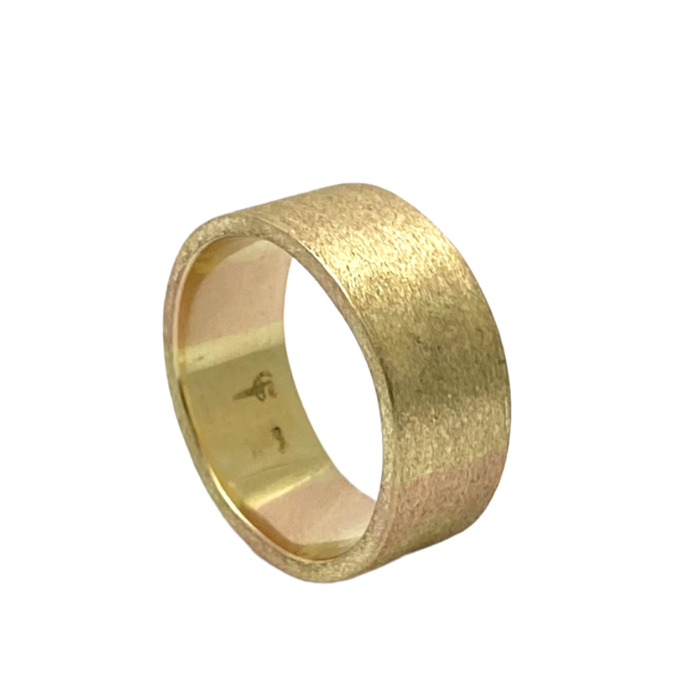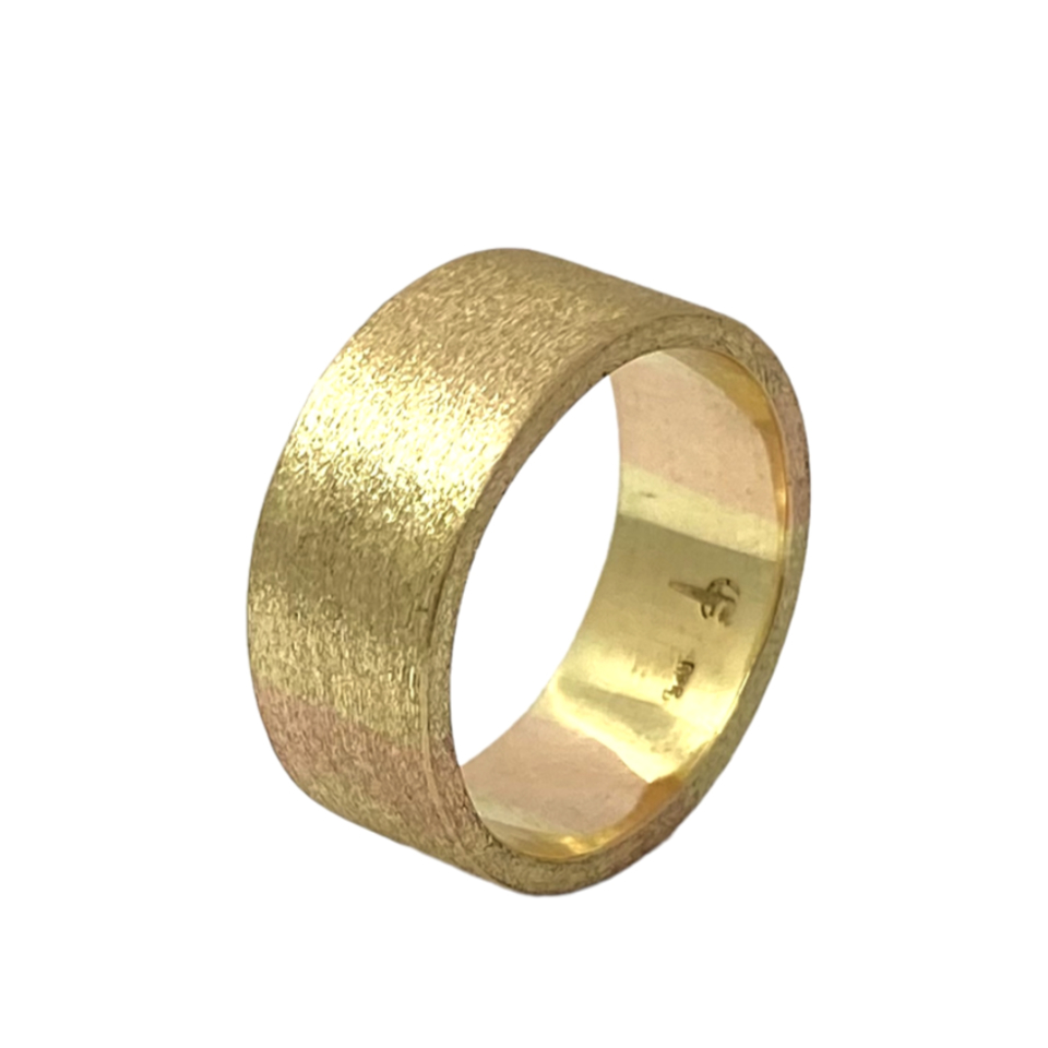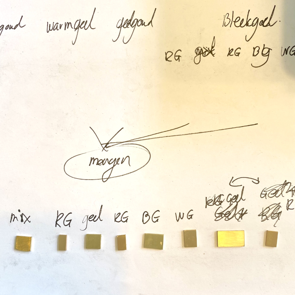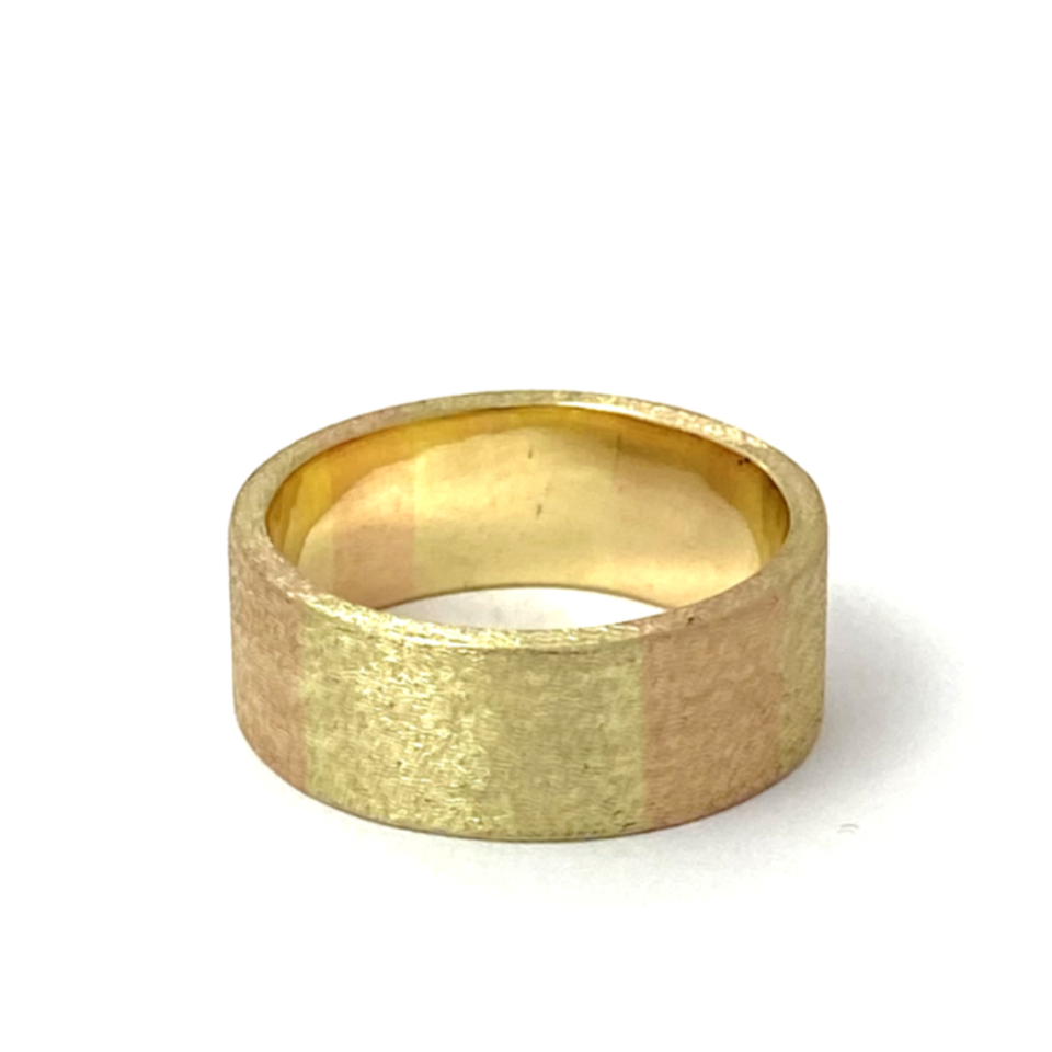 Van deze sieraden, hun oude goud / family goud, wat ze geërft hebben van een tante, wilde de moeder voor haar zoon een ring laten maken. Ik heb ieder sieraad van hun tante individueel omgesmolten, daarna alle zelfde kleuren goud bij elkaar samengesmolten, roodgoud, geelgoud, warm geelgoud en bleek geelgoud, ik voelde me een beetje een alchemist. Hiervan heb ik blokjes gemaakt door ze te walsen en uiteindelijk heb ik alle blokjes aan elkaar gesoldeerd en toen rond gezet tot ring. Je ziet zo een prachtig subtiel verloop van alle kleuren goud, the different shades of gold. De ring is grof en mat afgewerkt.