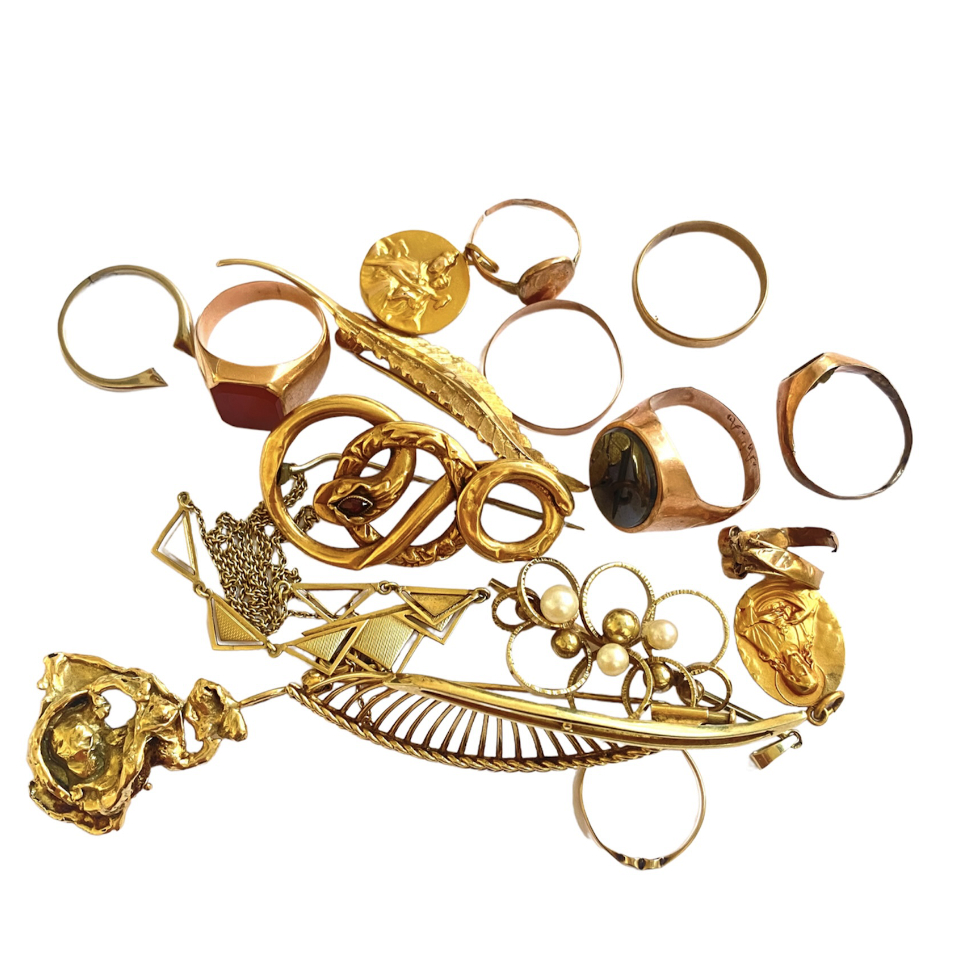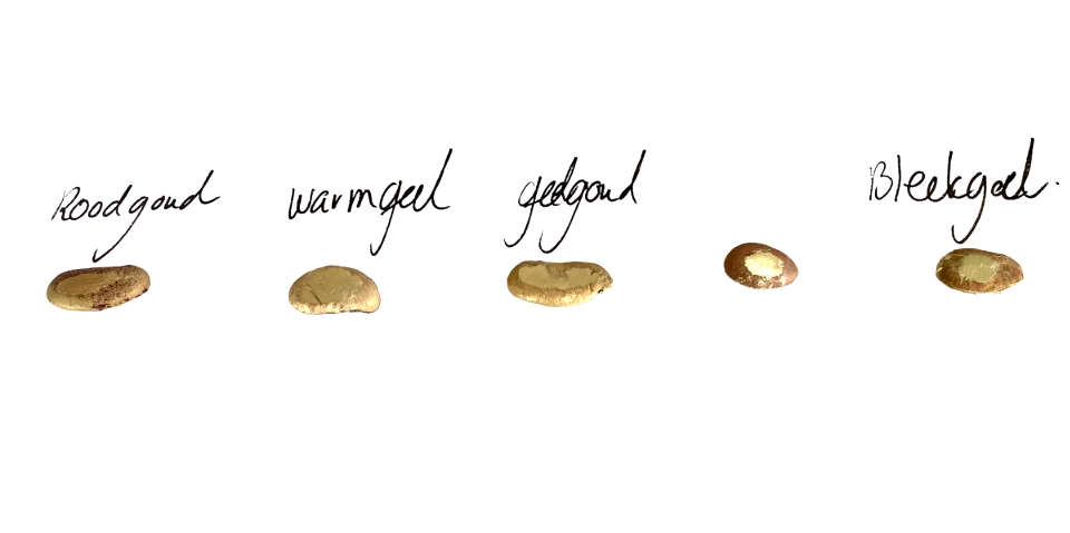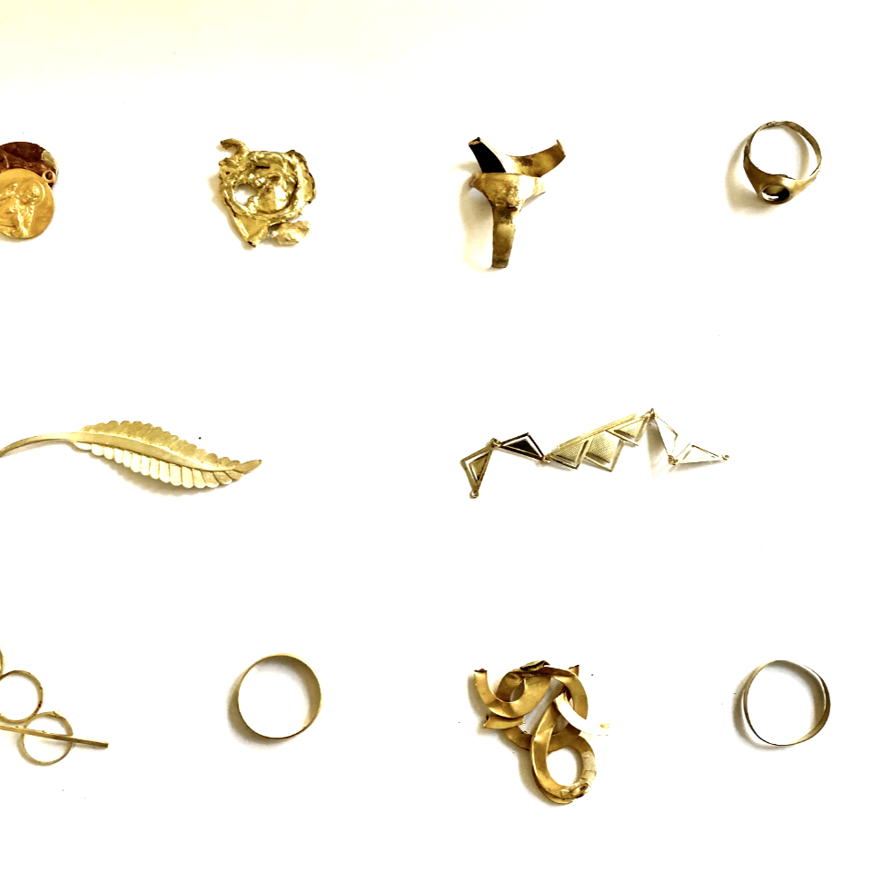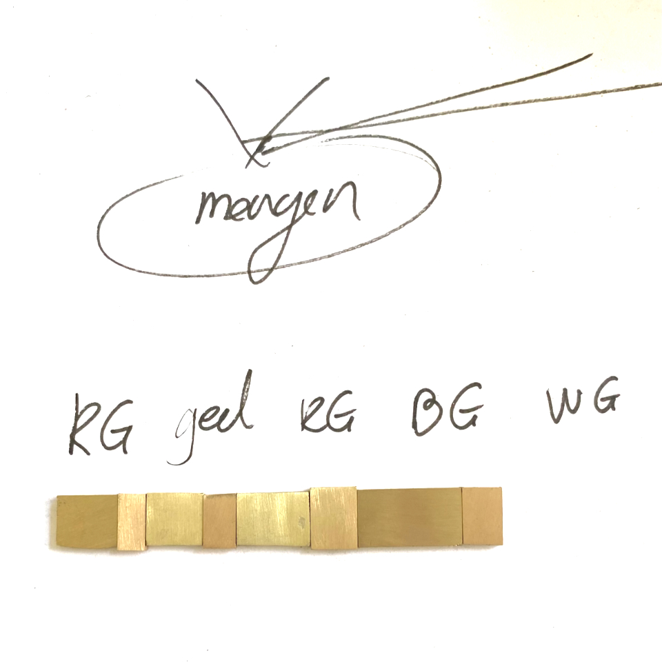 Van deze sieraden, hun oude goud / family goud, wat ze geërft hebben van een tante, wilde de moeder voor haar zoon een ring laten maken. Ik heb ieder sieraad van hun tante individueel omgesmolten, daarna alle zelfde kleuren goud bij elkaar samengesmolten, roodgoud, geelgoud, warm geelgoud en bleek geelgoud, ik voelde me een beetje een alchemist. Hiervan heb ik blokjes gemaakt door ze te walsen en uiteindelijk heb ik alle blokjes aan elkaar gesoldeerd en toen rond gezet tot ring. Je ziet zo een prachtig subtiel verloop van alle kleuren goud, the different shades of gold. De ring is grof en mat afgewerkt.