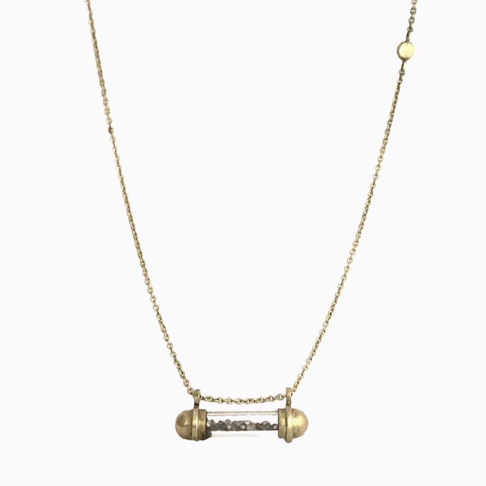 Het kokertje en de ketting zijn 14 krt.geelgoud, de diamantjes zitten in een glazen buisje.