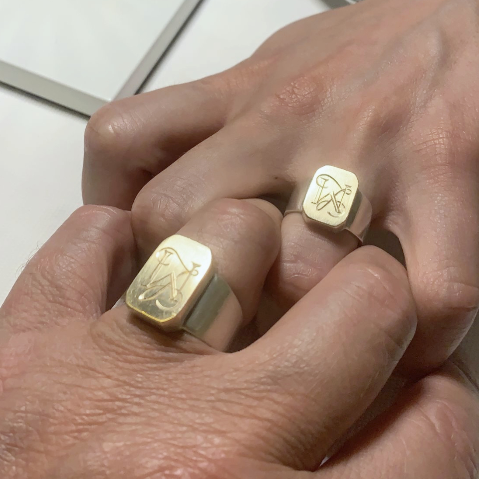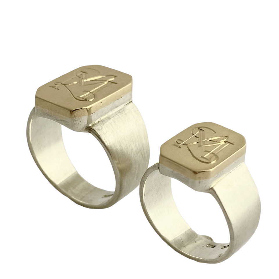 L & M wilden een zegelring als trouwring met hun beide initialen door elkaar heen gewoven, de ring moest een zegelring lijken maar moest wel een uitgesproken en stoere twist hebben.